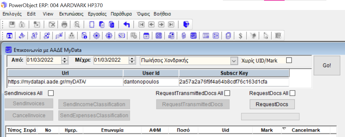 Από το μενού όψεις ο χρήστης επιλέγει "επικοινωνία με ΑΑΔΕ" και επιλέγοντας την ημερομηνία από... εως.... και την κατηγορία των παραστατικών που θέλει να εμφανιστούν. Στην συνέχεια πατάει την επιλογή "sendinvoices" και τα παραστατικά αποστέλονται στην ΑΑΔΕ.