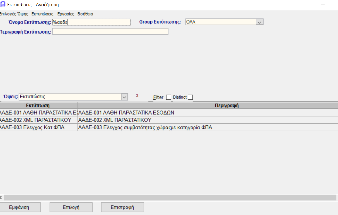Από το μενού "εκτυπώσεις" ο χρήστης επιλέγοντας "όλες οι εκτυπώσεις" και στη συνέχεια στο όνομα εκτύπωσης πατώντας "%ααδε" , θα του εμφανιστούν 3 είδη εκτυπώσεων που σχετλιζονται με ΑΑΔΕ.