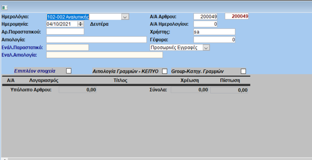 ⮚Ημερολόγιο: καθορίζουμε τον κωδικό του ημερολογίου, στο οποίο θα καταχωρηθεί το λογιστικό άρθρο.