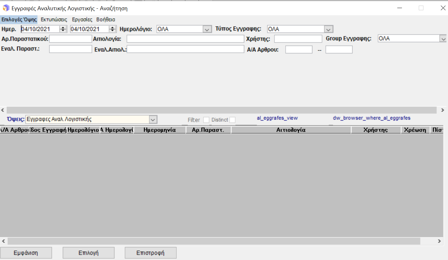Το παράθυρο διαχείρισης - προβολής άρθρων, μας δίνει την δυνατότητα να έχουμε μια εποπτική εικόνα των αναλυτικών εγγραφών που έχουμε καταχωρήσει.