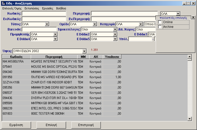 Το ίδιο θα συμβεί και αν «τσεκάρουμε» τις αντίστοιχες επιλογές στην ενότητα των ειδών. Δηλαδή, αν επιλέξουμε On Line θα εμφανιστούν μόνο τα είδη που έχουν κινηθεί και αν επιλέξουμε Archive θα εμφανιστούν όλα μας τα είδη.