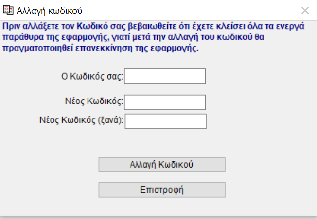 Πληροφοριακό ΕγχειρίδιοΕργασίες Αλλαγή κωδικού Αλλαγή κωδικού Από το μενού εργασίες ο χρήστης πατώντας "Αλλαγή κωδικού" έχει τη δυνατότητα να αλλάξει τον κωδικό εισόδου στο σύστημα αφού εισάγει βέβαια τον παλιό κωδικό.