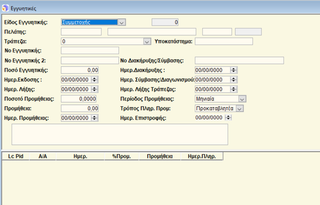 από τη μπάρα εργαλείων μπορούμε να επιλέξουμε συναλλασόμενο που θα συνδέεται με την εγγυητική επιστολή, να εισάγουμε νέα προμήθεια (ctrl + ins), να ελέγγξουμε τις εγγραφές προμηθειών, να διαγράψουμε προμήθεια, (ctrl + shift + del, να δούμε την εικόνα της εγγυητικής.