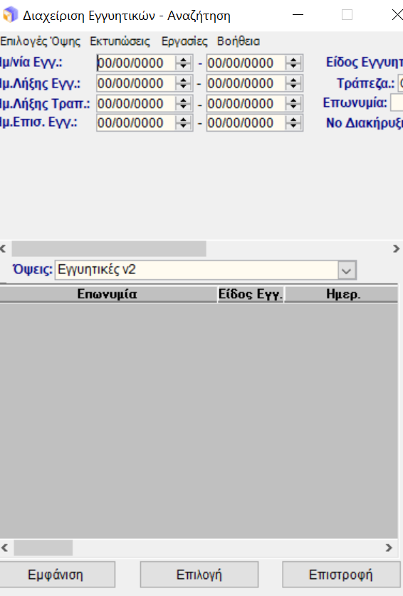 Είδος εγγυητικής, Νο εγγυητικής, Ημερομηνία λήξης εγγραφής, τράπεζα, Νο. εγγυητικής 2, Ημερομηνία λήξης τραπ., επωνυμία, ΑΦΜ, Ημερομηνία επισ, εγγραφής, Νο διακήρυξης σύμβασης.
