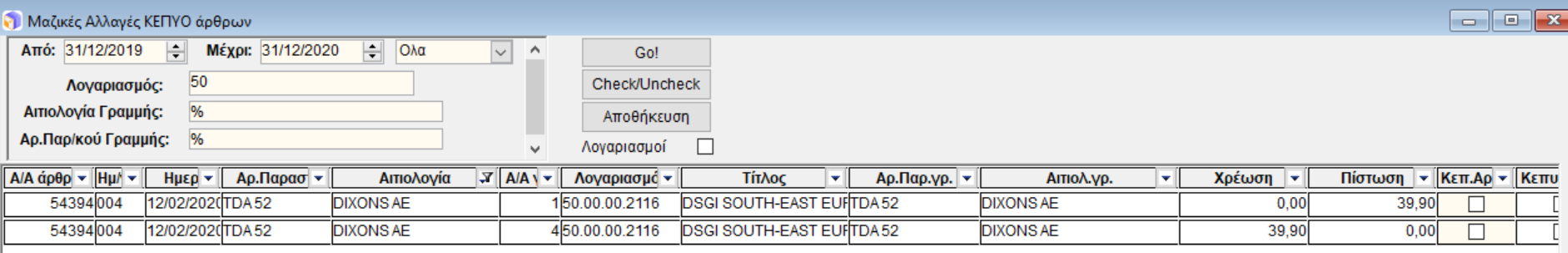 Από το μενού "Μαζικές επιλογές ΚΕΠΥΟ άρθρων" από το μενού "όψεις" μπορούμε να ορίσουμε την ημερομηνία που μας ενδιαφέρει, το λογαριασμό που μας ενδιαφέρει και προαιρετικά αιτιολογία γραμμής και αριθμό παραστατικού γραμμής. Με αυτόν τον τρόπο και επιλέγοντας GO εμφανίζονται τα αντιστοιχα άρθρα και στη συνέχεια μπορούμε να τα επιλέξουμε μαζικά με την επιλογή Check/Uncheck ορίζοντας τα ΚΕΠΥΟ άρθρα ή όχι, δηλαδή άρθρα που θα σταλθούν στην εφορία μέσω της συγκεντρωτικής που κάνουν οι εταιρίες στο τέλος του χρόνου ή όχι.