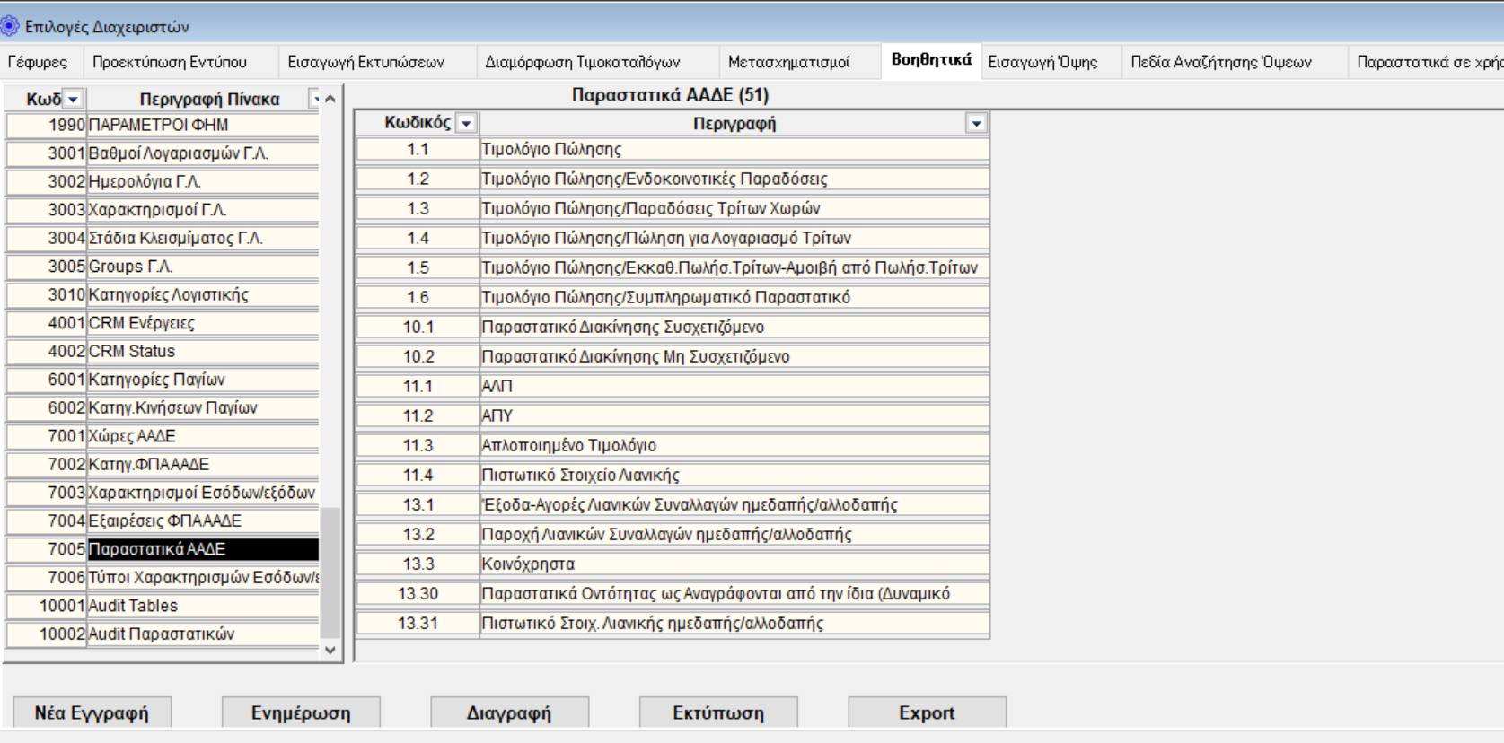 - Παράμετροι Προγράμματος: με την επιλογή αυτή κάνουμε αλλαγές ως προς εμφάνιση των όψεων (π.χ. η όψη να δείχνει το παραστατικά κατά ημέρα ή μήνα ή έτος), μπορούμε επίσης να αλλάξουμε το password του χρήστη.
