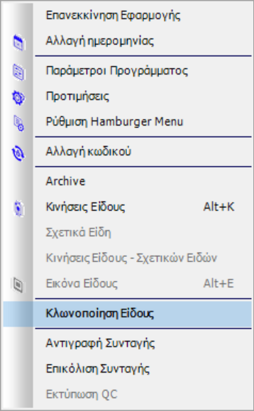 Εάν ένα είδος το έχουμε καταχωρίσει ξανά και δε θέλουμε να περάσουμε από την αρχή τα στοιχεία του, πατάμε το δεύτερο κουμπί από το tool bar προκειμένου η επιφάνεια μας να τεθεί από ‘’μόνο για ανάγνωση’’ σε λειτουργία ‘’επεξεργασίας’’ . Από τις ‘’εργασίες’’ πατάμε Κλωνοποίηση Ειδών και στη συνέχεια επεξεργαζόμαστε τα στοιχεία που θέλουν αλλαγή, προσέχοντας πάντα στα παραμετρικά των συμπληρωματικών στοιχείων να έχουμε συμπληρώσει σωστά τον ‘’οίκο’’.
