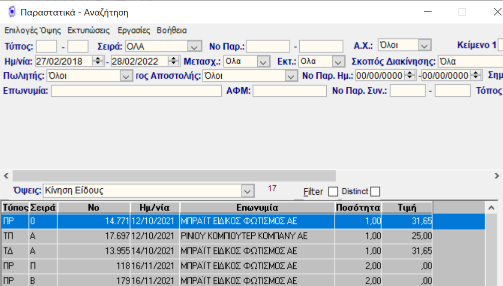 Για να δούμε την κίνηση του κάθε είδους, αρκεί από το Browser «Εργασίες» του προγράμματος να επιλέξουμε την επιλογή "Κινήσεις Είδους". Στην συνέχεια μας παρουσιάζονται όλα τα παραστατικά που αφορούν το συγκεκριμένο είδος για το χρονικό διάστημα που θα ορίσουμε εμείς.