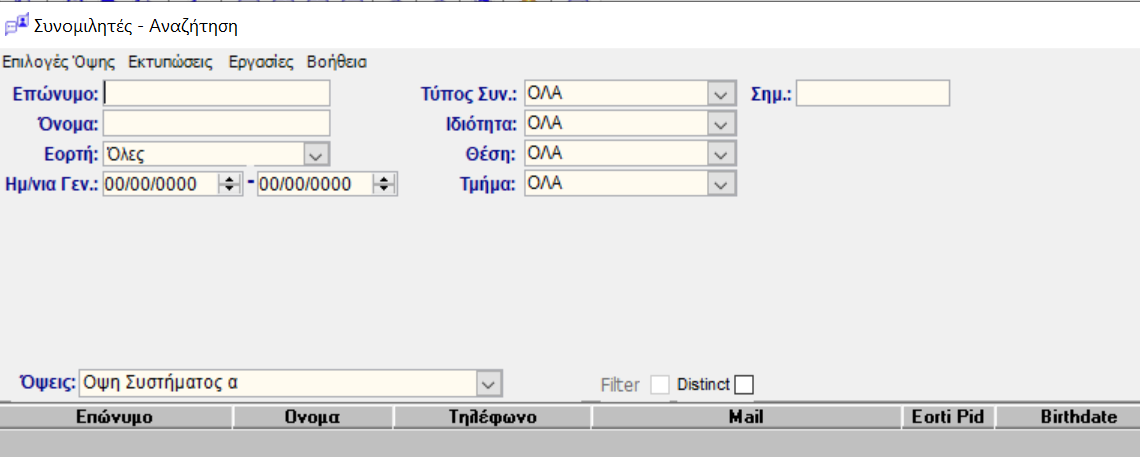 Επίθετο, τύπος, όνομα, σύντμηση Ον. Πατρός, τηλ., κινητό, Fax, e-mail, ιδιότητα, θέση, τμήμα, εορτή, ημ. Γέννησης, ημέρα γενεθλίων, σημειώσεις.