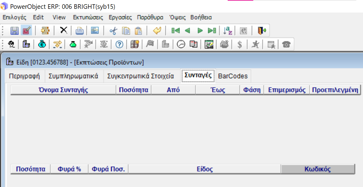 Το πεδίο Συνταγές εμφανίζεται εφόσον ανοίξουμε ένα είδος το οποίο είναι προιόν μιας επιχείρησης. Στη συνταγή περιγράφονται τα υλικά καθώς και η ποσότητα του εκάστοτε υλικού που χρειάζεται για να υλοποιηθεί το προιόν.